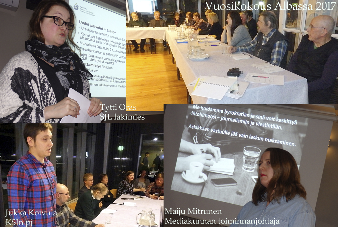 Kuva vuoden 2017 vuosikokouksesta. Puheenjohtajaksi valittiin Jukka Koivula. Liiton puheenvuorot kuultiin Tytti Orakselta ja Maiju Mitruselta.