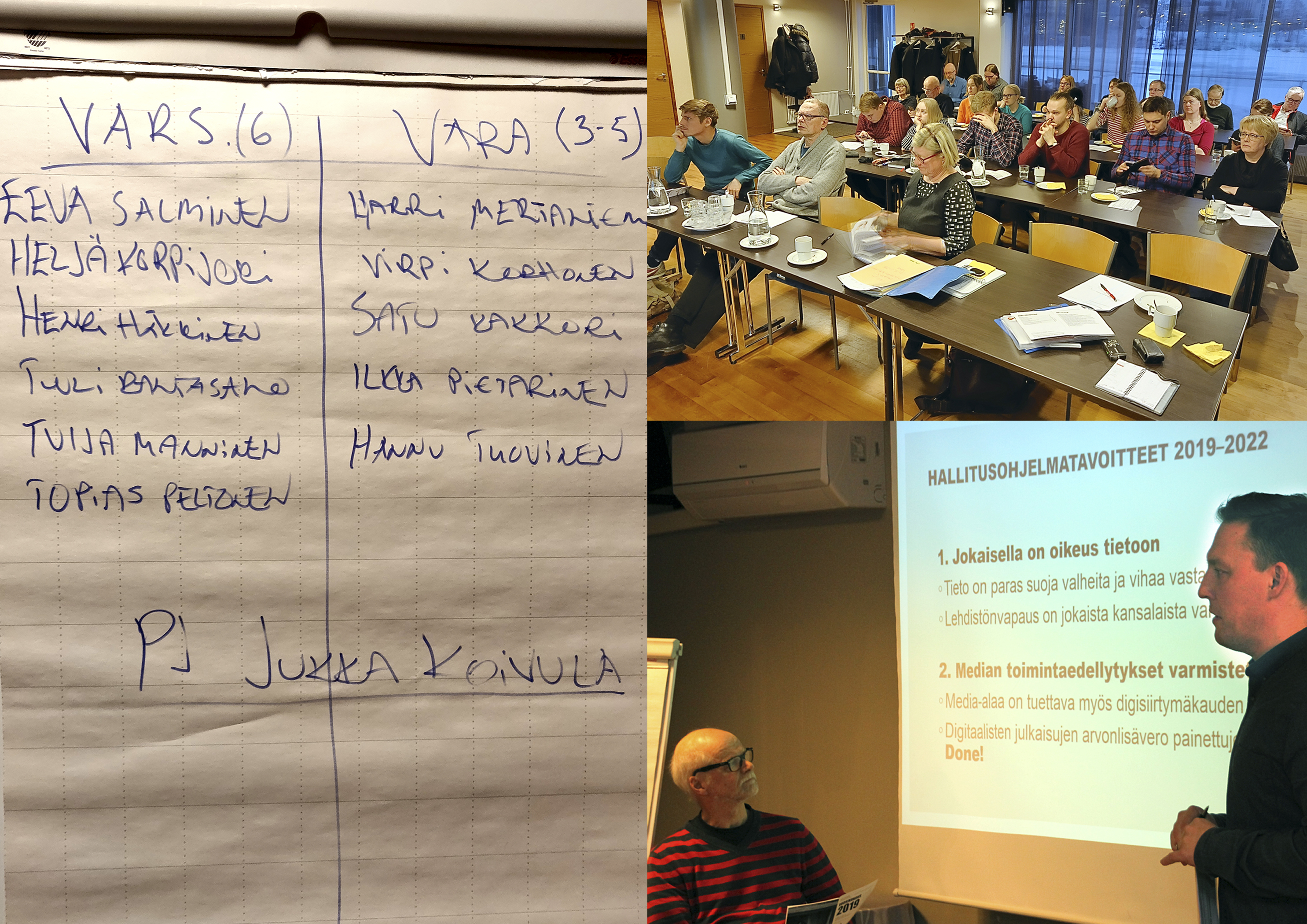 Fläppitaulussa KSJn ehdokkaat KSJn hallitukseen, samalla myös lopulliset valinnat. Oik. ylänurkassa innokkaasti keskustellut vuosikokousväki. Alakulmassa SJLn puheenvuoron käyttänyt palvelujohtaja Simon Huldén (oik) ja kokouksen puheenjohtajuuden rutiinilla hoitanut Jarkko Mänttäri.