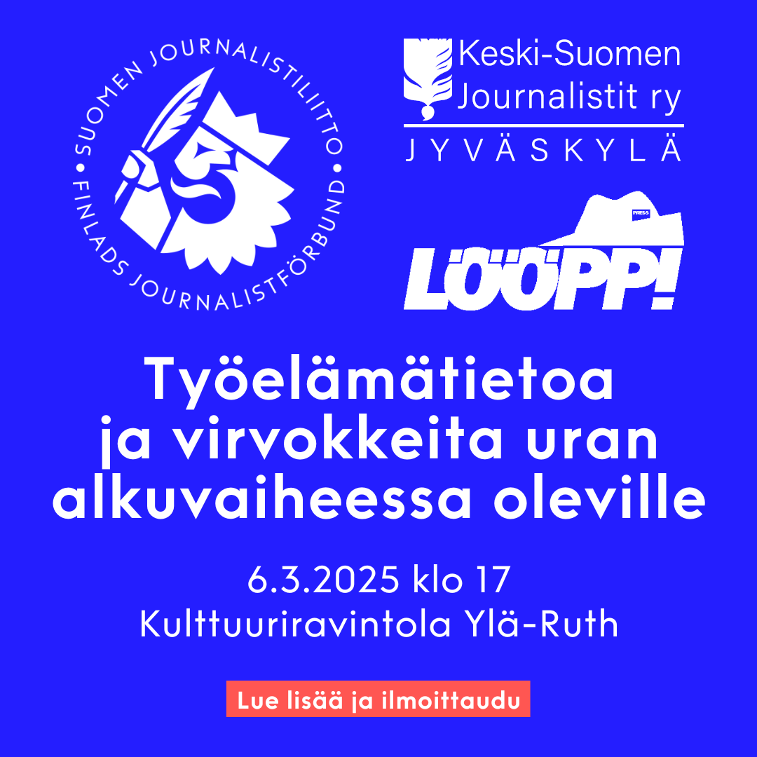 Tilaisuuteen ovat tervetulleita kaikki KSJ:n ja ainejärjestö Lööpin jäsenet. Koska tila on rajallinen, voit varmistaa paikkasi ilmoittautumalla jäsenkirjeeseen tulleen linkin kautta tai lähettämällä sähköpostia KSJ:n asiamiehelle sihteeri@ksjournalistit.fi.
