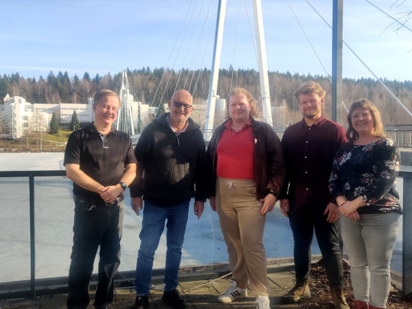 Keski-Suomen Journalistit ry:n vastavalitun hallituksen jäseniä poseerasi yhdistyksen vuosikokouksen jälkeen Jyväskylän Mattilanniemessä lauantaina. Kuvassa vasemmalta Ilkka Hartio, Martti Ratia, puheenjohtaja Teemu Lähde, taloudenhoitaja Juho Silventoinen ja Matleena Ylikoski. Kuva: Emma Jolkkonen
