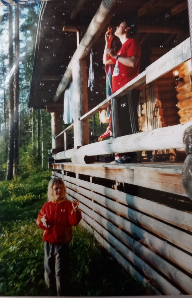 Pääkuva: Selkälässä jonakin vuonna, kuopus Vilja ja Satu, taustalla iskä-Jari, kuvan otti esikoinen Mari.