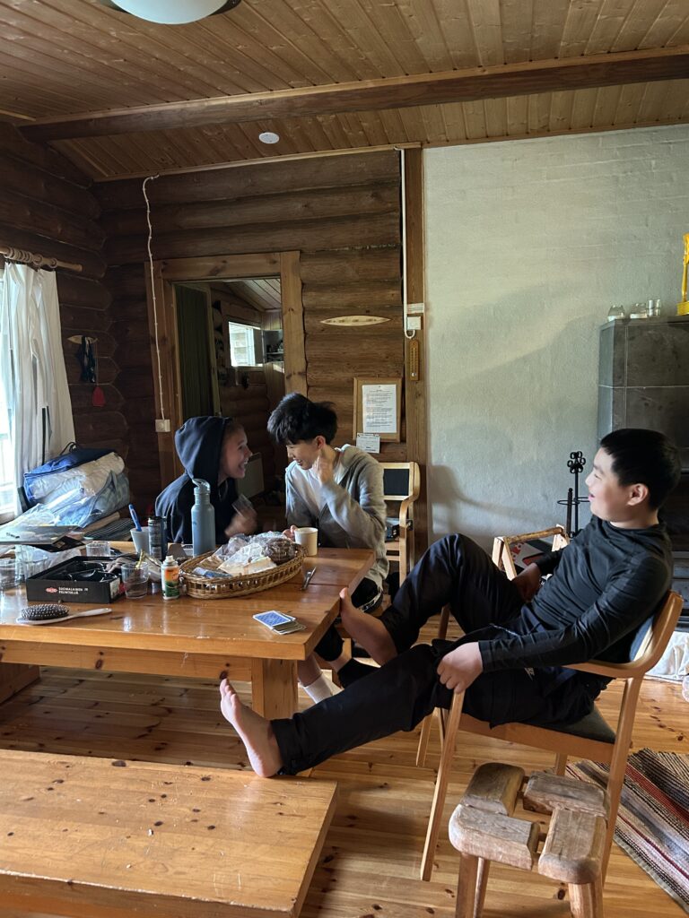 Koska teinien kännykät olivat hyödyttömiä, pelasimme yhdessä Aliasta. Kaikkia nauratti. Ympärillä pöydällä olivat suloisessa sekamelskassa hyttysmyrkyt, hammasharjat, päiväkirjat, voiveitset ja pelikortit. Otin kuvan muistoksi, vaikka muistaisin muutenkin.
