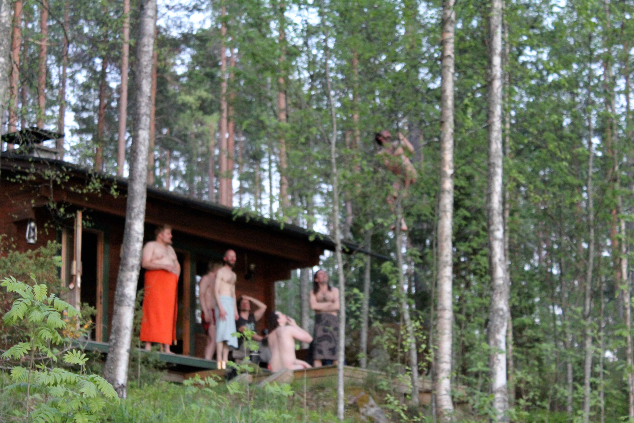 Siinä lämpimässä taisi jo silmäkin lupsahtaa, kunnes säpsähdin pahanpäiväisesti: jostain alkoi kajahdella moniäänistä – ja kovaäänistä – laulua. Männikkömetsät ja rantojen raidat. Mitä täällä tapahtuu? Keski-Suomen kotiseutulaulu tuntui kaikuvan joka puolella ympärilläni, mökin yläpuolelta ja järveltä päin takaisin.
