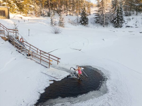 Talviuintiin saat halutessasi vinkkejä paikalla olevalta yhdistyksen jäseneltä, lajin harrastajalta Anna Kiviseltä. Tossut jalkaan!